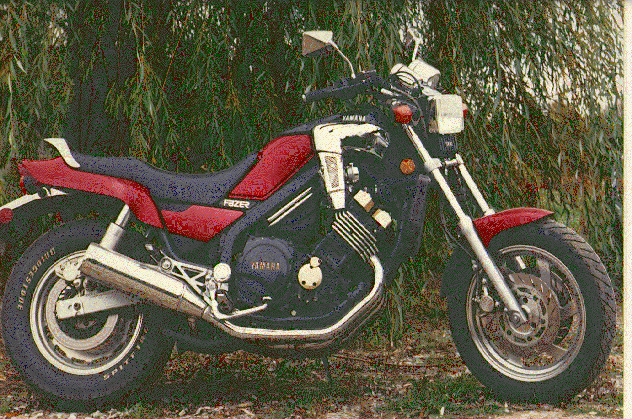 My wife's bike was a 1986 Yamaha FZX 750 Fazer -- way cool! Here is a larger colour gif. Have a look at a huge colour gif of a friend's Fazer too if you like. She had the Fazer from 1990 to 2001. In February 2000, we bought her a 1998 Yamaha YZF600R2 Thundercat. I have a bit of information about her YZF600R including some accessory reviews.